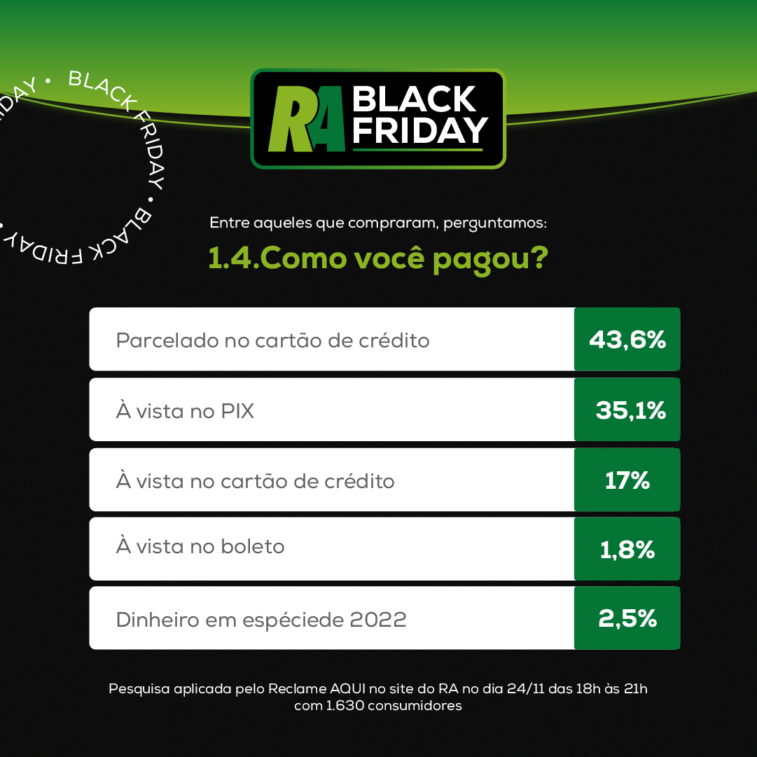 E tal como antecipado nas pesquisas, 43,6% parcelaram as compras no cartão de crédito e 35,1% preferiam à vista no PIX. Em relação ao valor das compras, a expectativa estava alta. Na última pesquisa, em novembro, o maior percentual era para comprar acima de R$ 1.000. Entretanto, na pesquisa das últimas horas antes do fim da Black Friday, essa intenção levemente diluiu, e 34,4% apostaram em tickets entre R$ 100 e R$ 500 e 56% acima de R$ 1.000.